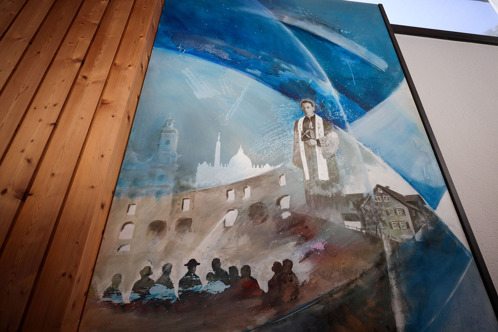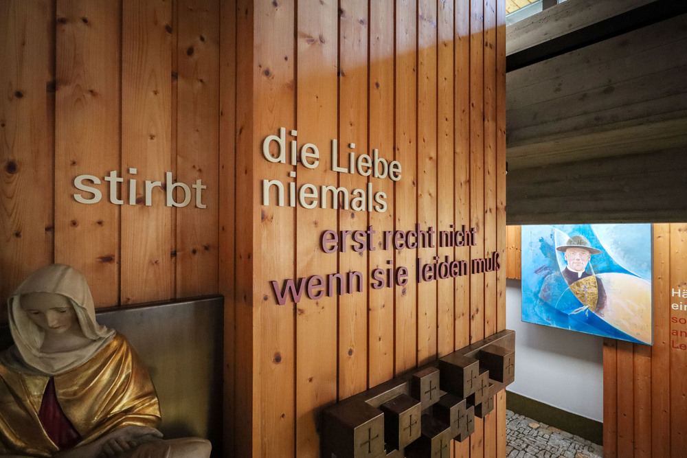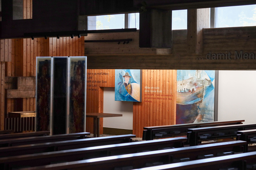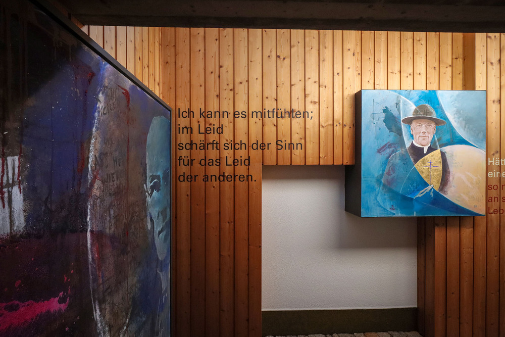 Besonders eindrucksvoll ist das Bild von Carl Lampert, der sein selbst gefertigtes Kreuz auf Höhe seines Herzens hält. Dieses Kreuz, das er im Kerker anfertigte, war ihm eine Brücke zwischen Hoffnung und Verzweiflung, eine Quelle der inneren Stärke. Eingebettet in ein sanftes, goldenes Licht, symbolisiert das Kreuz Lamperts tiefe Glaubenskraft und seine Fähigkeit, selbst in dunkelsten Stunden Hoffnung zu finden. Worte von ihm, die im Hintergrund zu lesen sind, lassen erahnen, wie sehr ihm sein Glaube half, auch in scheinbar ausweglosen Situationen aufrecht zu bleiben.