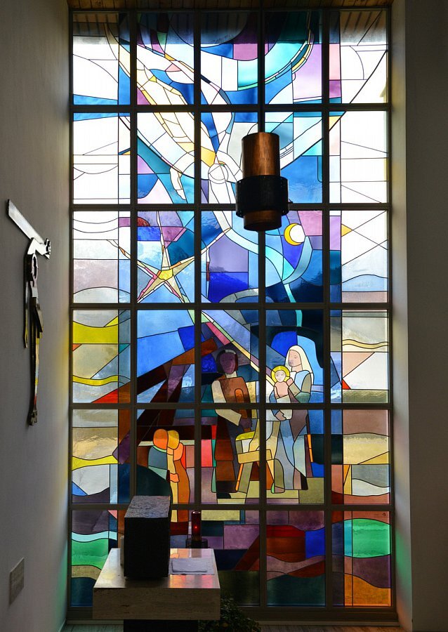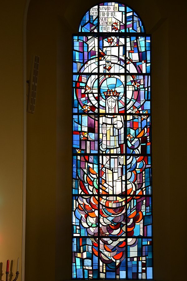 Marianne Feigl / Marte führte als, jüngste Glasermeisterin Österreichs damals, die handwerkliche Ausführung mit Martin Häusle 1958 für die Jesukirche Bregenz aus.
