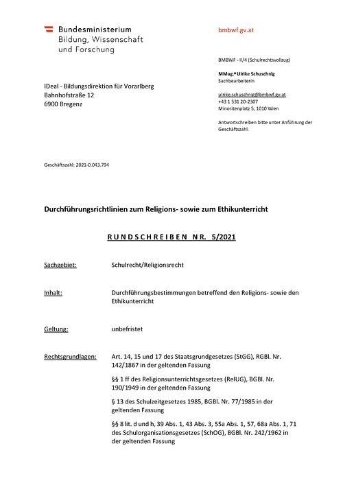 Durchführungserlass "Religions- und Ethikunterricht"